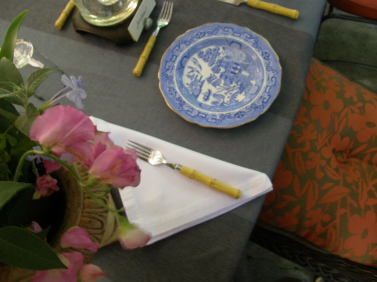 LIKE THIS PATTERN FOR TABLES. Sunbrella/JR pattern Upland in Denim, a nice wide stripe. The chair seats are Flower Power/Melon. So easy to entertain when I use Sunbrella for tables skirts and chairs. Easy care & heavy wear.