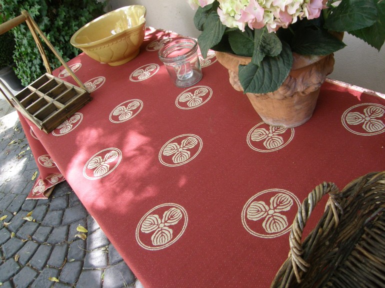WELCOME REFRESHMENT AREA. I used my Sunbrella pattern Chinois/Henna for the table that gets the most spills and activity on a hot LA summer evening. This pattern was inspired by a kimono I purchased in Kyoto ,Japan.