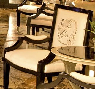 Designer Roger Thomas used a sharpie magic marker to create Post Modern motifs on the Sunbrella upholstery fabric.