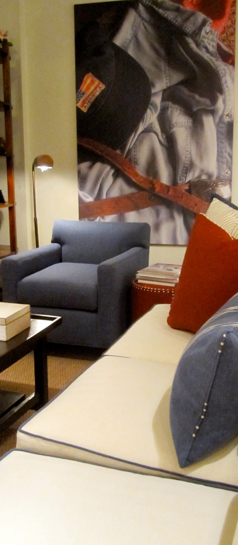 Celebration of Made in America; designer Joe Ruggiero introduces Sunbrella Sax/Denim with 30% recycled yarns. This “Made in America” fabric has the feel and look of American made Denim. Shown on the Hillsboro club chair and as comfortable as a prized Denim cowboy shirt. All available at Miles Talbott Furniture. All wood furniture from Gat Creek. Also on display, North Carolina pottery from Why Not Potters.